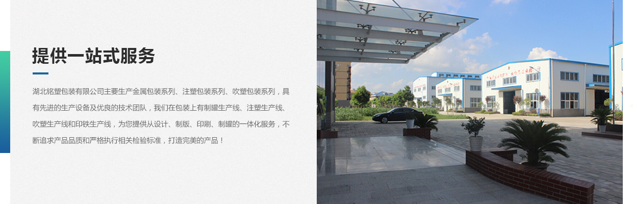 湖北銘塑包裝有限公司一家集研發(fā)、生產(chǎn)、銷售于一體的較優(yōu)秀民營企業(yè),技術(shù)力量雄厚,產(chǎn)品質(zhì)量可靠。位于交通暢順,百業(yè)興旺、經(jīng)濟富裕、政策開放的孝感開發(fā)區(qū)域。我們企業(yè)的營銷戰(zhàn)略是以建筑為土壤,以產(chǎn)品為種子,以質(zhì)量為肥料,讓綠色鋪滿全球。憑借多年來的行業(yè)經(jīng)驗,公司不斷進行創(chuàng)新和研發(fā),為市場提供更廣泛的產(chǎn)品應(yīng)用領(lǐng)域和更好環(huán)保節(jié)能產(chǎn)品,為國家能源環(huán)保戰(zhàn)略和可持續(xù)發(fā)展戰(zhàn)略作出應(yīng)有的貢獻。     湖北銘塑包裝有限公司主要生產(chǎn)金屬包裝系列、注塑包裝系列、吹塑包裝系列,具有先進的生產(chǎn)設(shè)備及優(yōu)良的技術(shù)團隊,我們在包裝上有制罐生產(chǎn)線、注塑生產(chǎn)線、吹塑生產(chǎn)線和印鐵生產(chǎn)線,為您提供從設(shè)計、制版、印刷、制罐的一體化服務(wù),不斷追求產(chǎn)品品質(zhì)和嚴(yán)格執(zhí)行相關(guān)檢驗標(biāo)準(zhǔn),打造更好的產(chǎn)品!